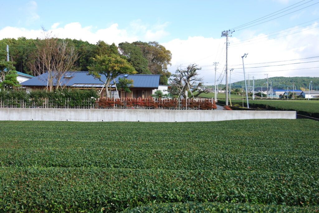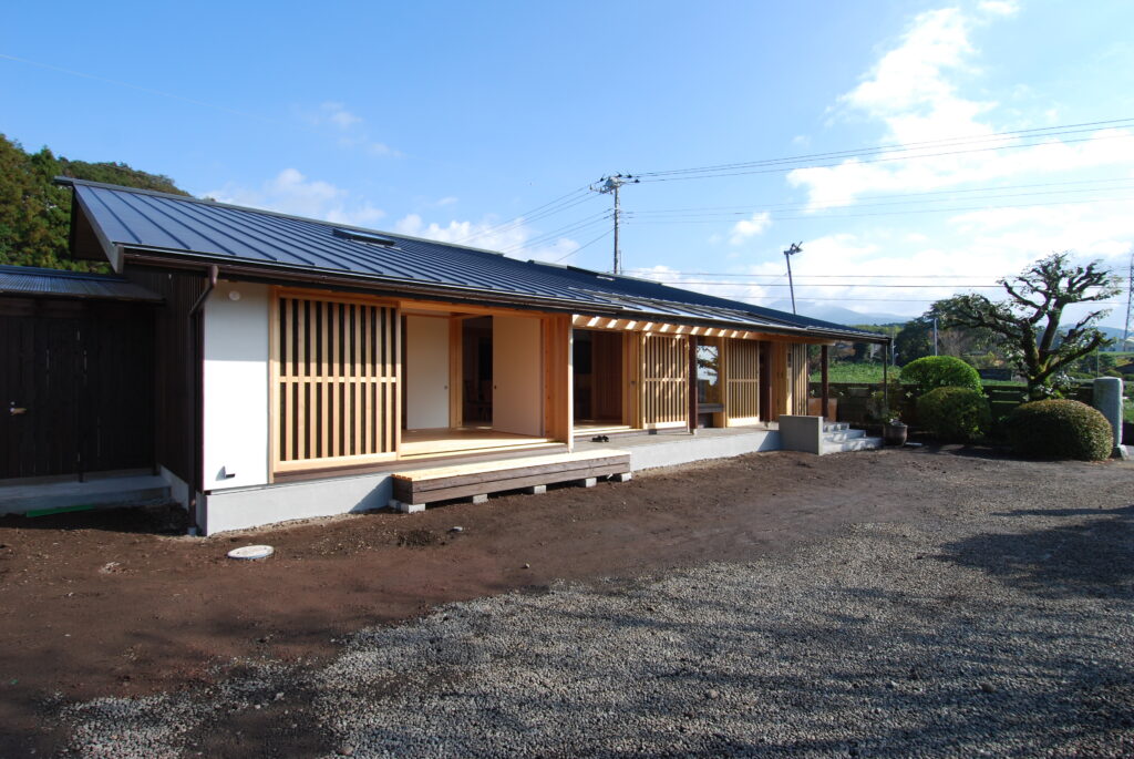 S君家族の家、富士ヒノキの家は、周囲をお茶畑にかこまれた、富士山の麓、富士市内にあります。平屋にみえる棟の低い佇まいですが、実は2階建ての大屋根の家です。