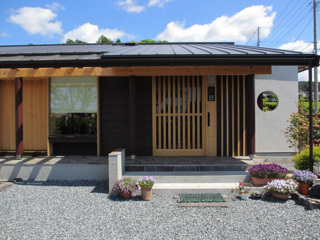 ダークブラウンの外壁は、杉板に浸透性の着色塗料を施しました。濃い色は耐候性もよく、落ち着いたシックな印象になります。ポーチの床は諏訪鉄平石敷きです。