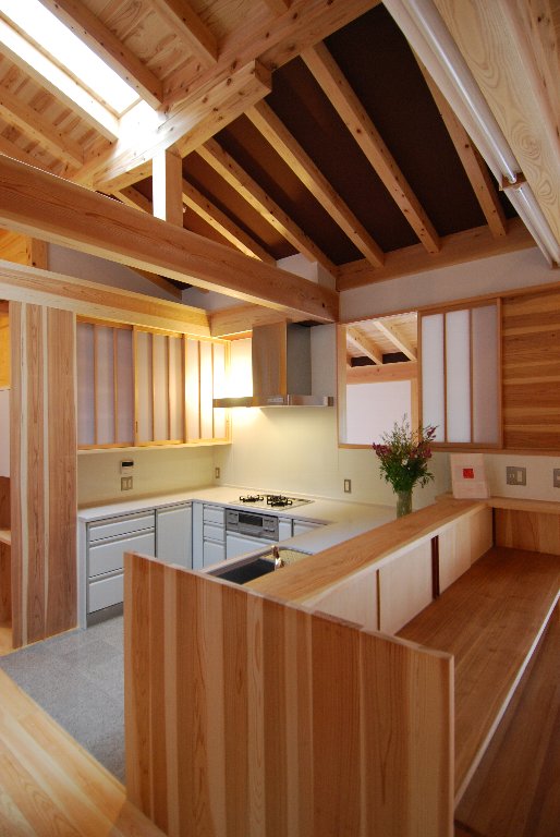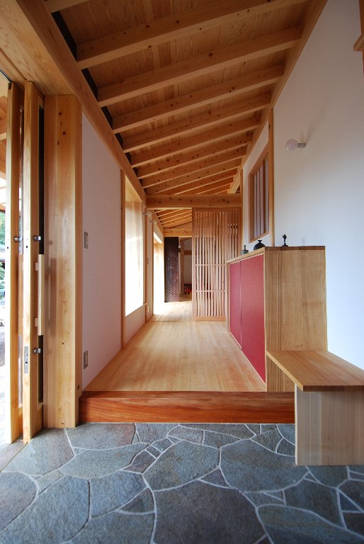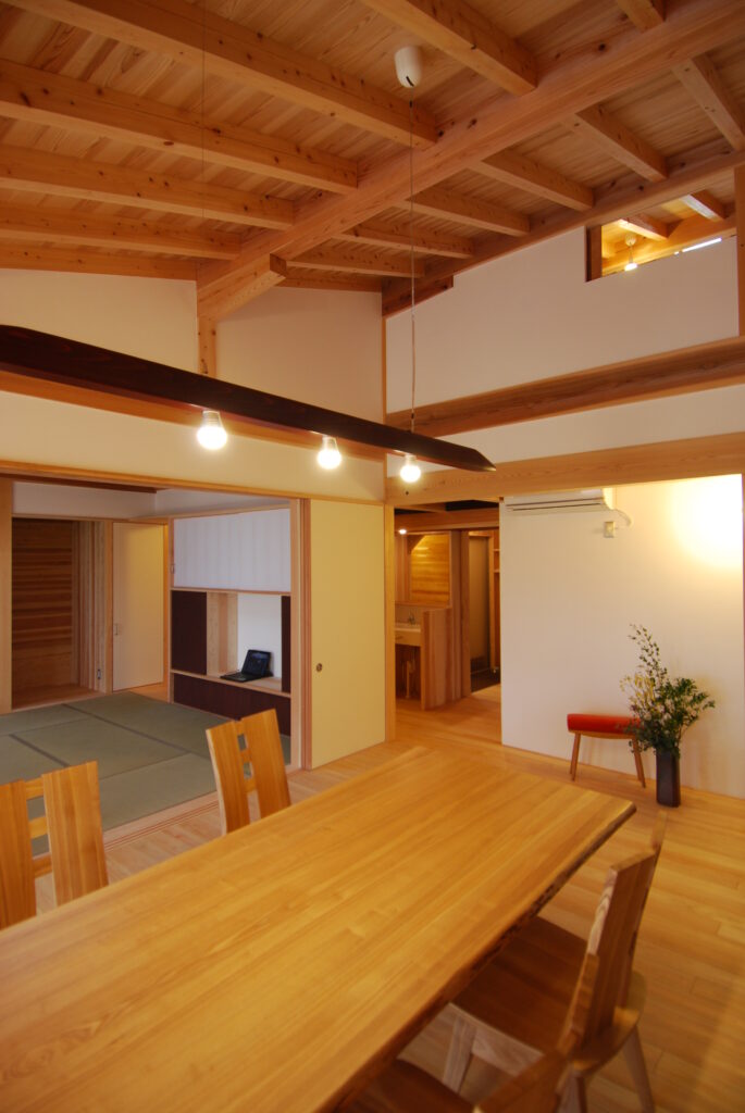 玄関から、格子戸の奥のリビングを見通します。垂木は75㎜×150㎜のヒノキ材。S家の山のヒノキ材です。ヒノキの垂木は、その前も、その後も使ったことがありません。