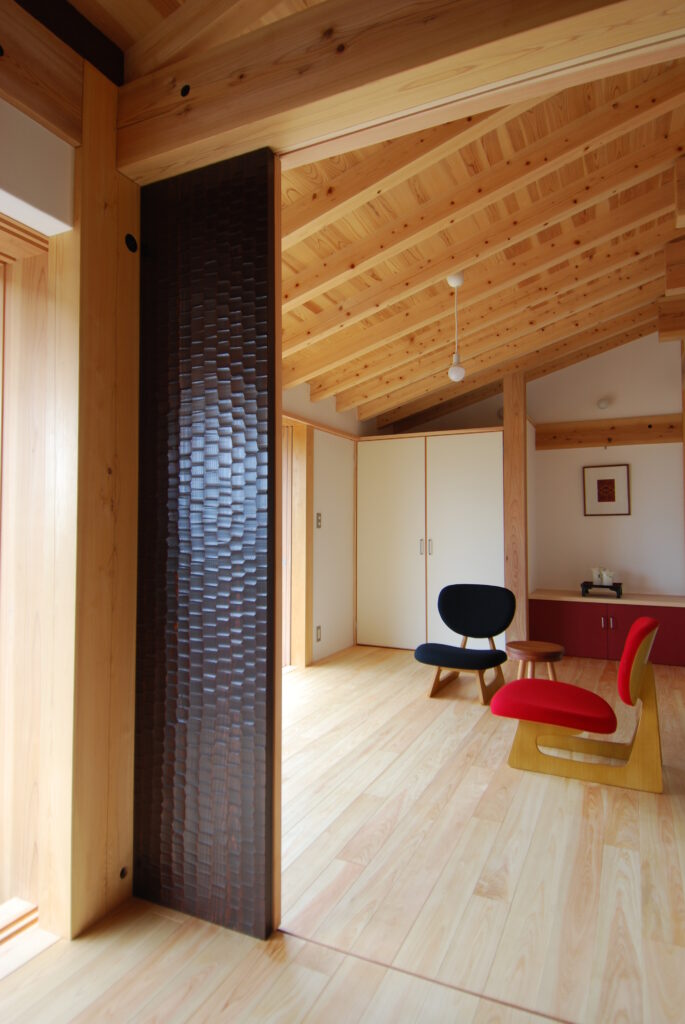 小屋組の母屋や棟木など、断面に限りがある自前のヒノキ構造材なので、肘木を接合部に使用しているのが見えます。スギ材よりも強度のあるヒノキ材。さらに肘木も使って万全な構造設計だと思っています。