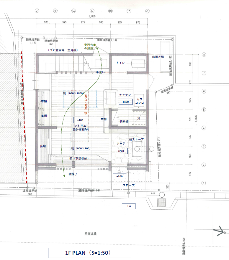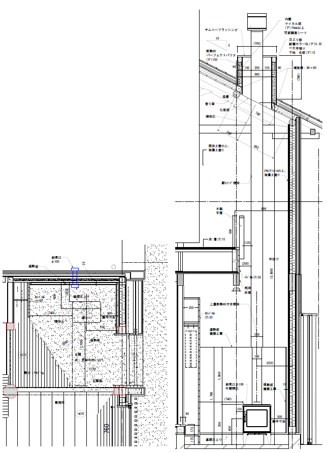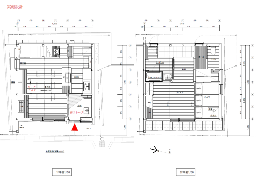 丸福町家の改修の間取り設計は2023年の秋から始めましたが、当初から薪ストーブの設置を希望していたため、ファーストプランには玄関土間に薪ストーブが描かれています。