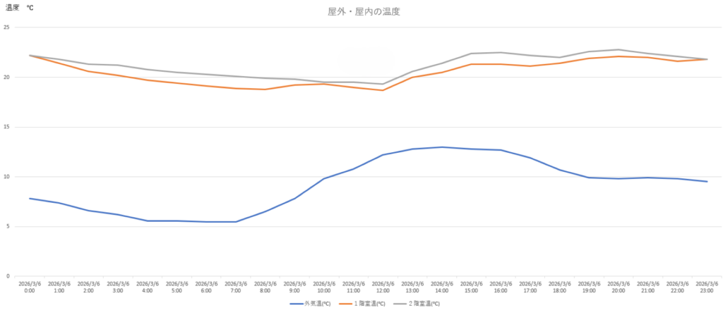 薪ストーブは朝9時頃火を入れて夜7時以降に自然鎮火しますが、室温は18℃から22℃の範囲でほぼ一定で、1、2階の温度差が無いことが分かります。屋外の気温は明け方の4時から7時頃は6℃以下にまで下がりますが、室内は前日の薪ストーブによる空気の余熱で、18℃程までしか下がりません。