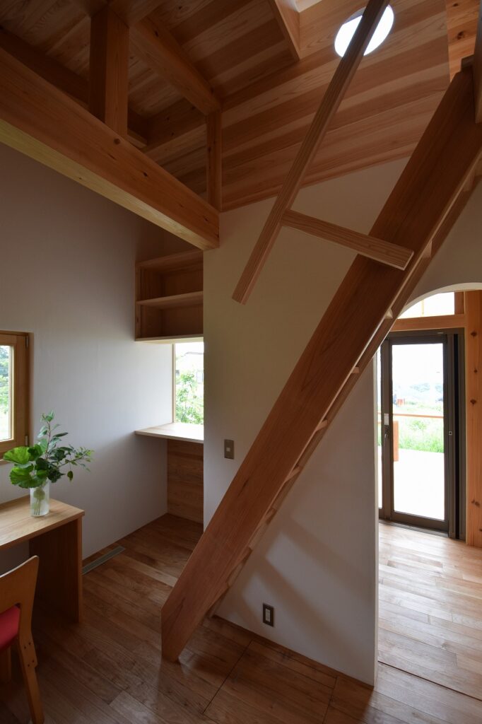 書斎には、物見台に登る急な階段があります。1坪の塔屋は半分が吹き抜けているので、Jパネルの手すりを丸く刳り抜くと、下からも空が見えます。