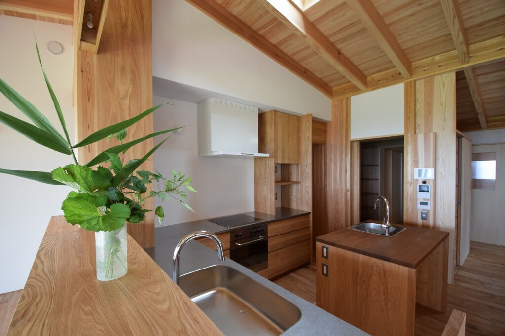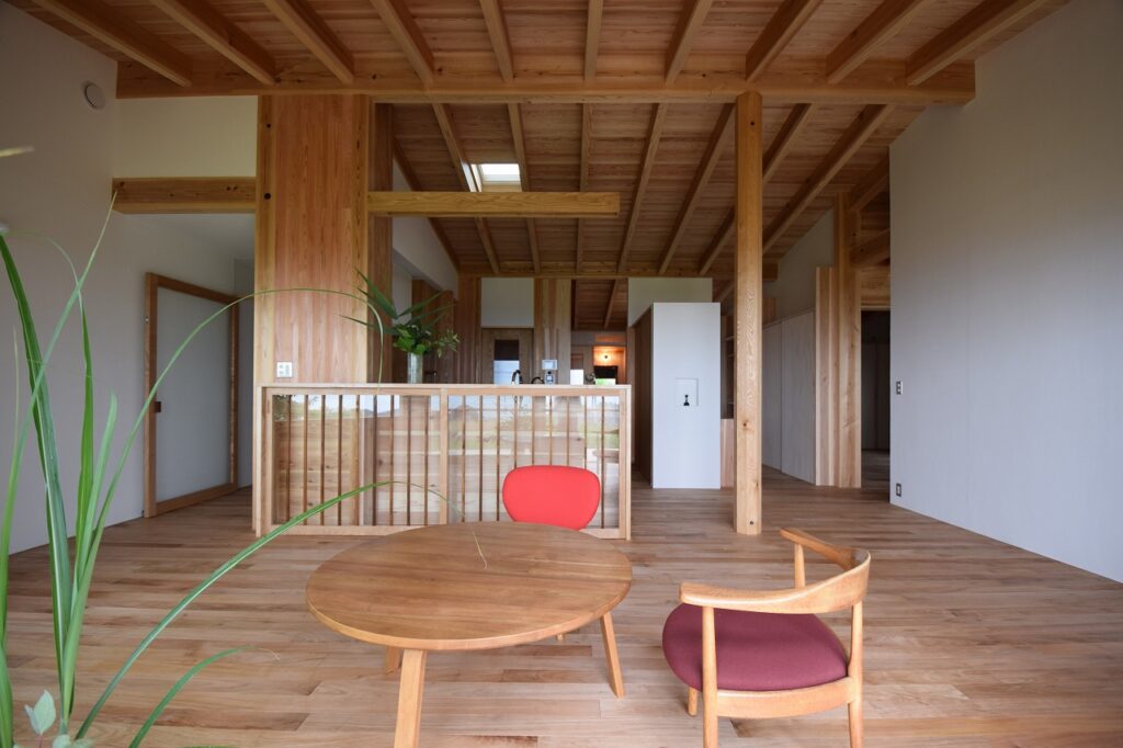 南のテラス窓から内部を見ます。屋根の形に沿った天井に見える垂木とJパネルの杉野地板。棟木を支えるのは径180の栗八角柱で、見えがかり長さは3210㎜です。