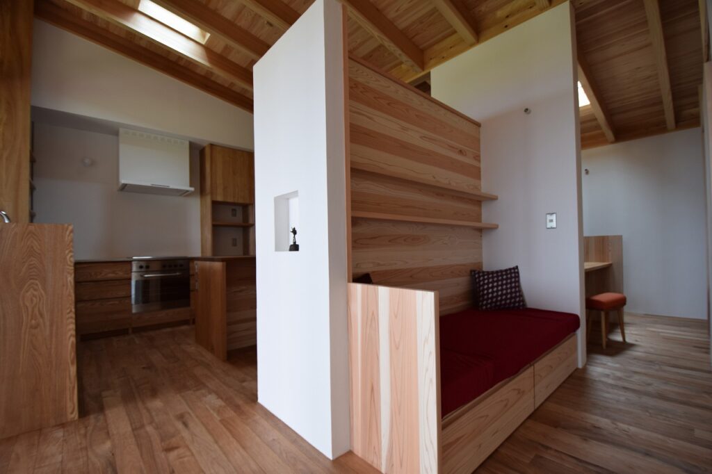 このベンチソファーの背面は台所から使う食器棚、並びには家事テーブルが見えます。南のリビングに向いた白い左官壁には、小さなニッチがあります。