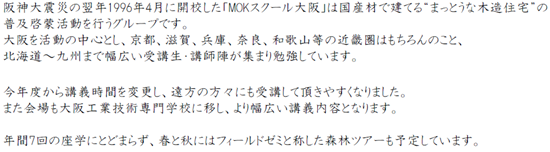 2012.03.14 2012年度MOKスクール 2012年度MOKスクールが開講します。第17期受講生募集のご案内です。 詳しくはこちら(MOKスクールホームページ)をご覧ください。 RELATED POSTS 関連する記事 2021年Ms仕事初め 2021.01.16 MOKゼミ神戸10月のご案内 2012.10.12 住宅医プレスクールFrom新潟で登壇します ~テーマは「地域材と住宅医」 2020.11.20