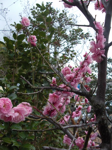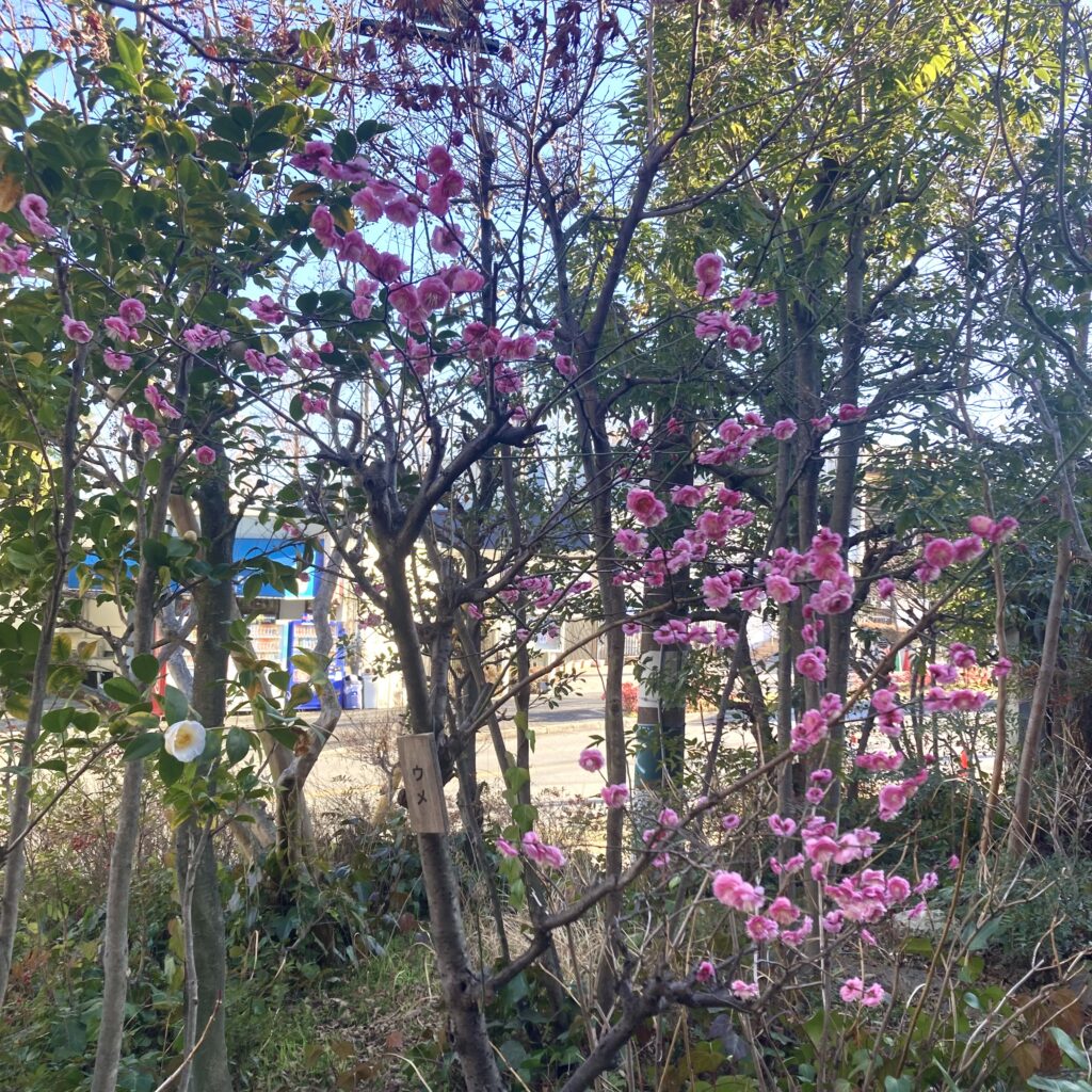 2月に髙田さんが撮った梅の花の左側にかわいらしい白椿が咲いているので、健在で間違いなし!