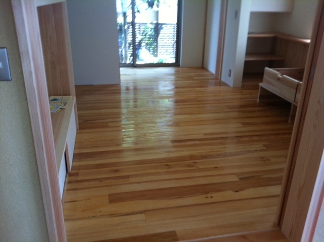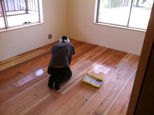 うちのスタッフが床の塗装をしています。2Fは杉のフローリングです。