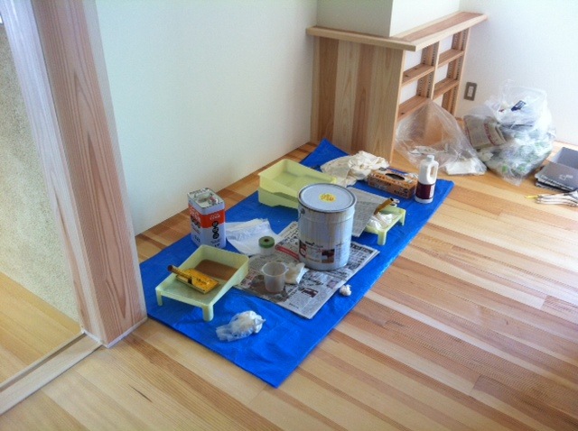 脱出が出来るように1Fの床を最後に塗ります。1Fのフローリングは赤松です。