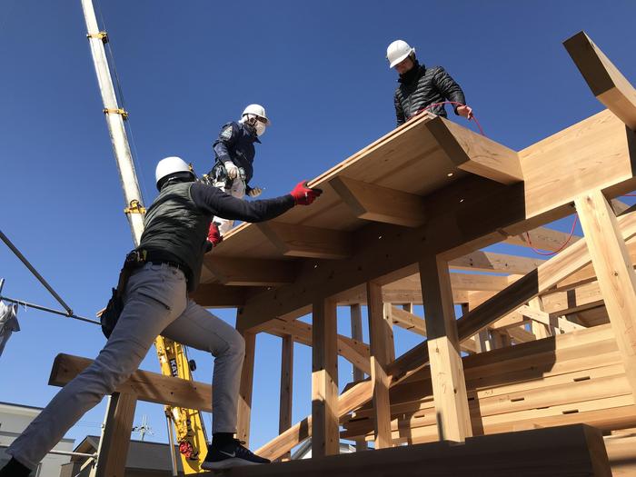 野地板として使われるJパネルがクレーン車で持ち上げられ