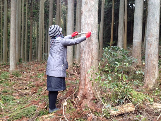 白いテープが巻かれているのが、今回の工事で使う木です。樹齢50年から60年程度の杉です。太さを測ると12センチ×27センチ程度の梁であればとれそうです。